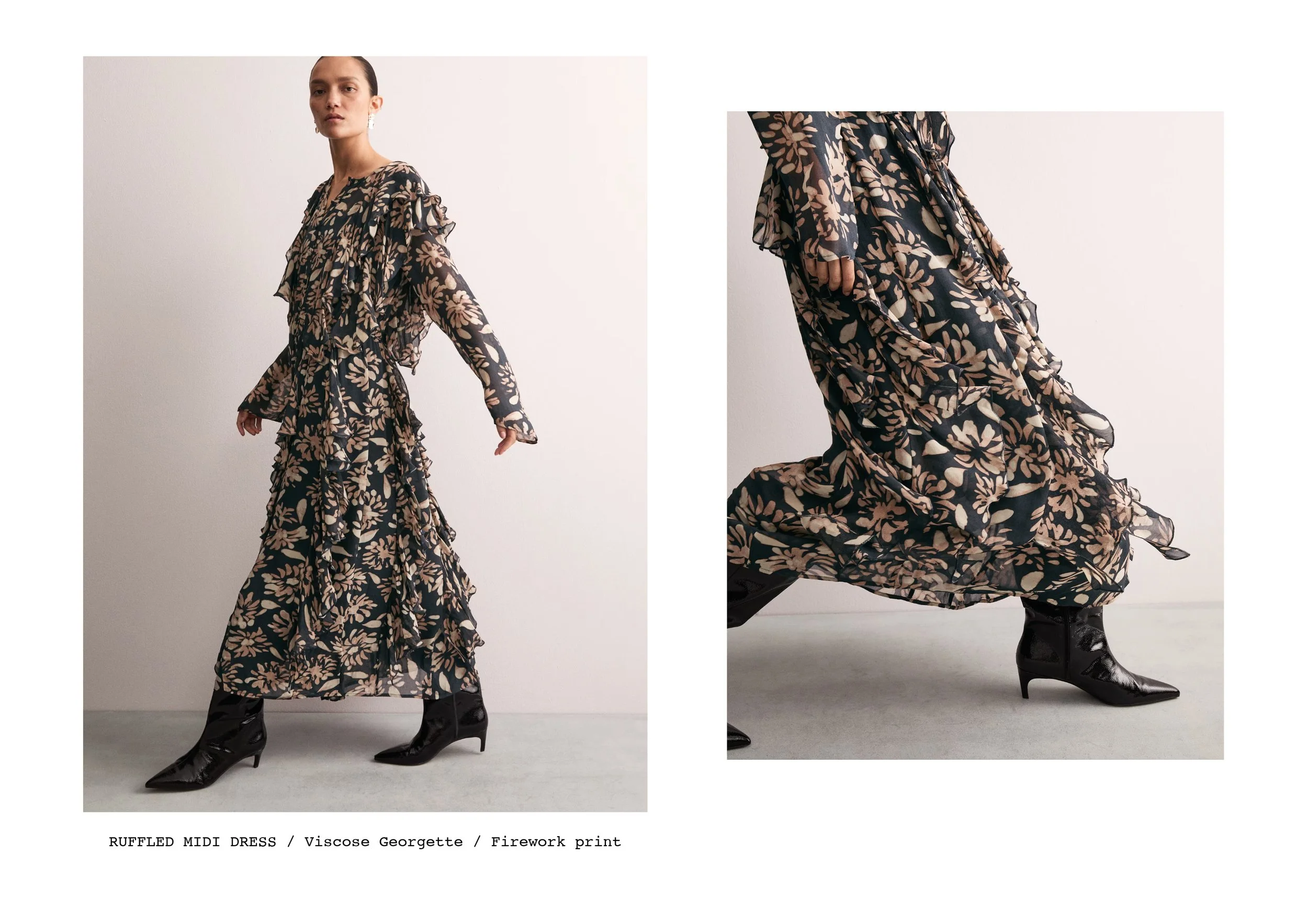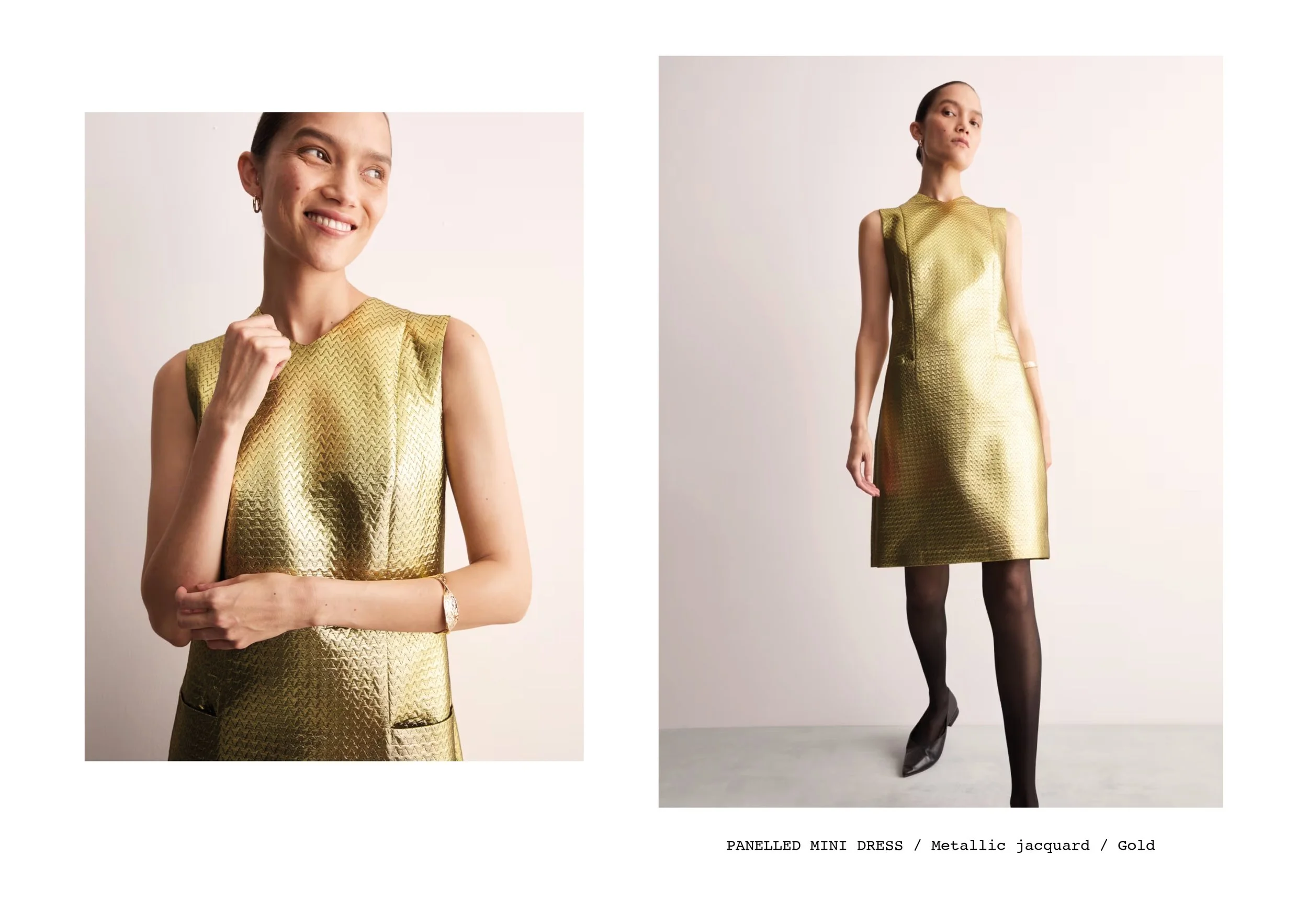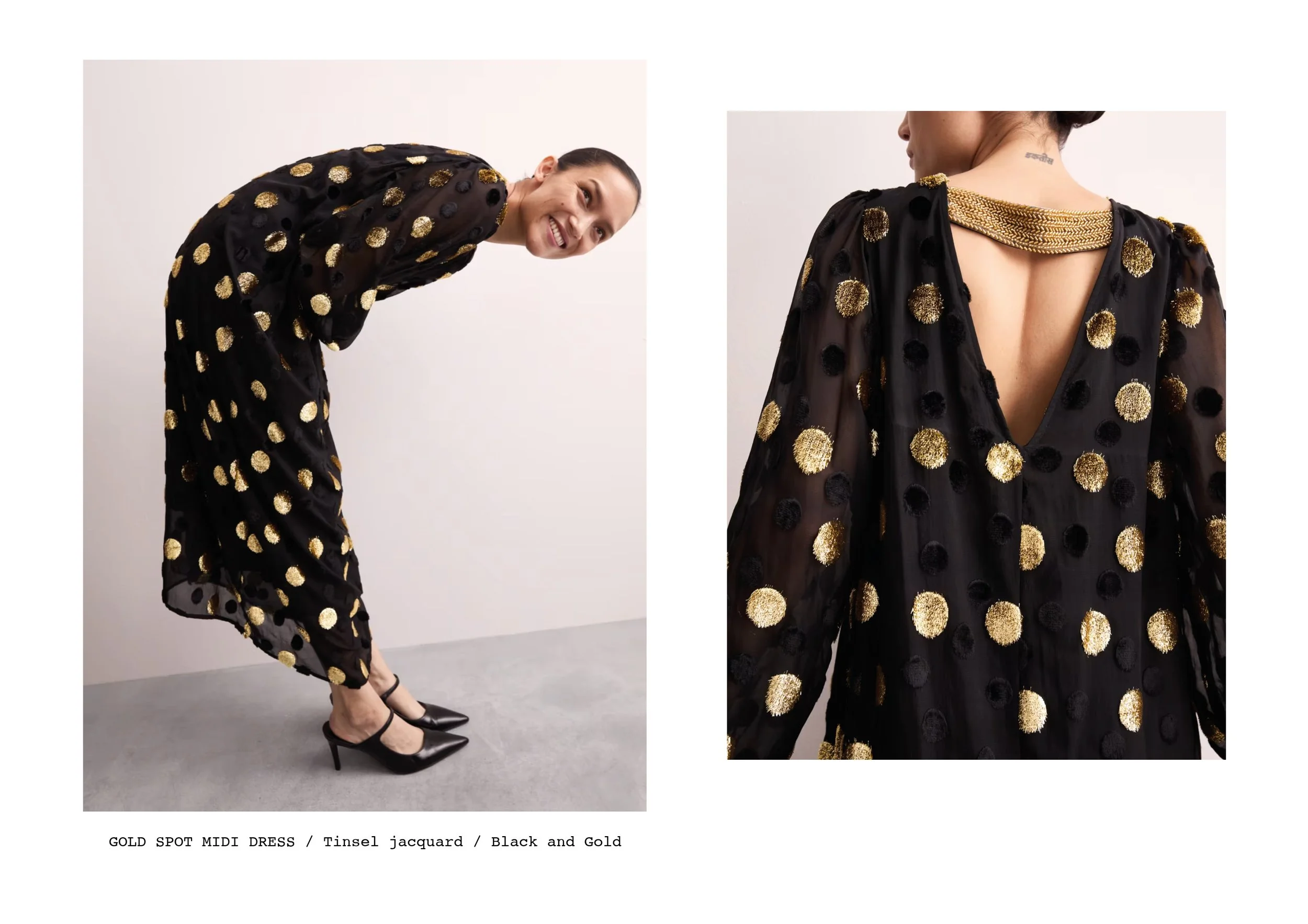 True event collection for November ‘24. This collection offers impactful evening wear with an ease of wear. Distinct gold, sheer fabrications and refined details compliment each other. The elegant firework print sits alongside gold, champagne, ivory and inky darks - champagne and fireworks in an inky sky.